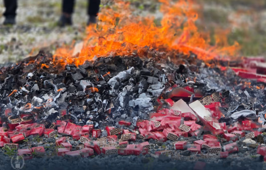Maldives Customs Service destroyed 1.83 million smuggled cigarettes seized at Addu port, December 7, 2025. (Photo/Customs)
