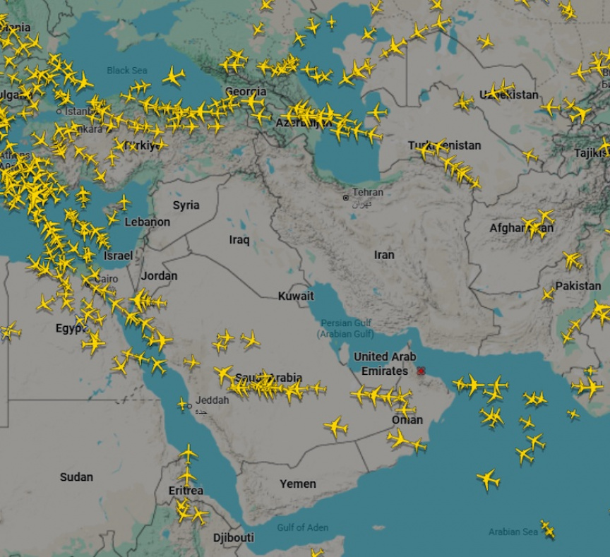 Airspace over Iran, Iraq, Kuwait and Jordan has emptied at around 1030 GMT. Screenshot via Flightradar24, February 28, 2026. (Photo/Reuters)