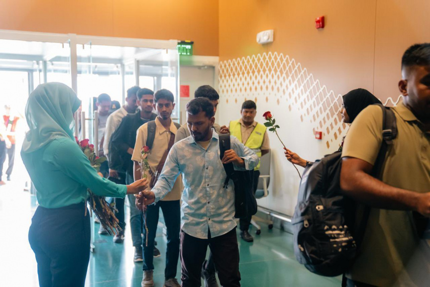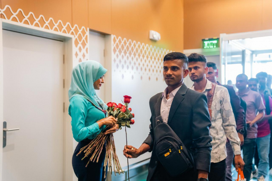 Passengers on a Maldivian flight from Dhaka are welcomed upon arrival to Male' on March 12, 2026. (Photo/Maldivian)