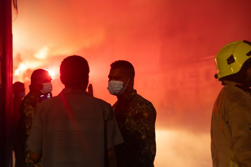 MNDF soldiers wear face masks near the Prime Godown on Izzuddin Magu, Male' city, where an intense fire broke out on March 18, 2026. (Sun Photo)