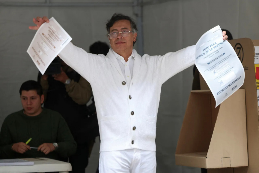 Colombian President Gustavo Petro shows ballots before voting in Bogota, March 8, 2026. (Photo/Reuters)