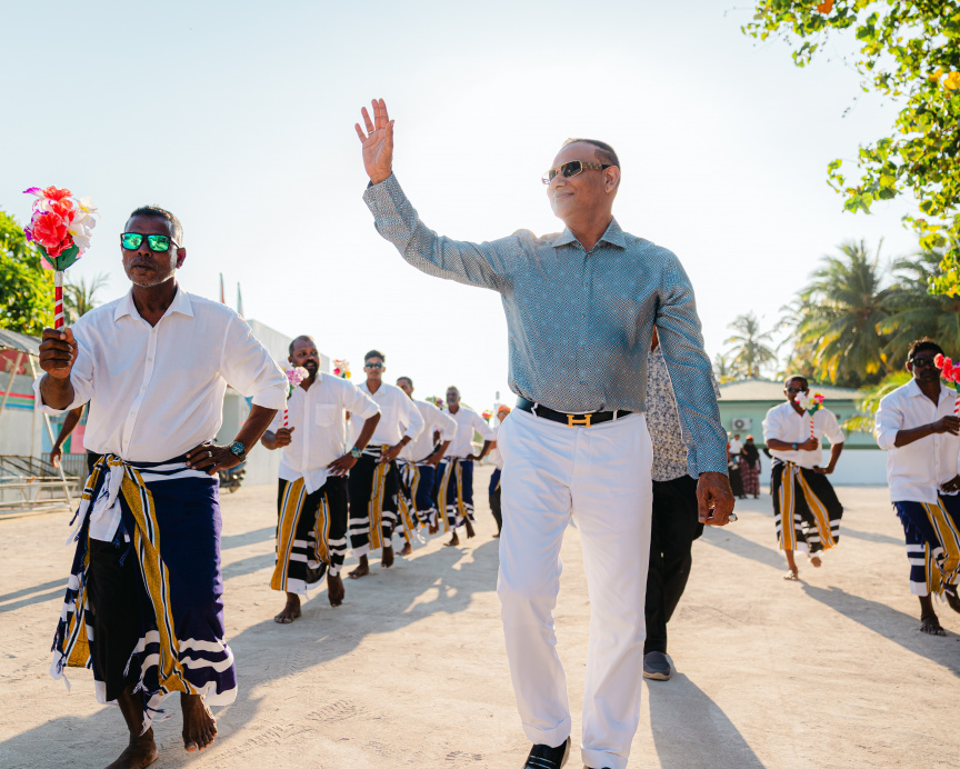 MDA President Ahmed Siyam Mohamed arrives in Dh.Hulhudheli, campaigning for the upcoming local council elections, April 2, 2026. (Sun Photo/Aaish Ashraf)