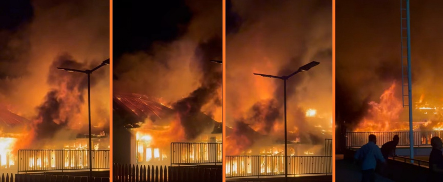 Screenshots from a social media video uploaded 21 minutes past midnight, depicting the massive fire burning through the G.A.Villingili Atoll Education Centre's staffroom area, April 3, 2026. (Facebook Video/Amaan Ibrahim)