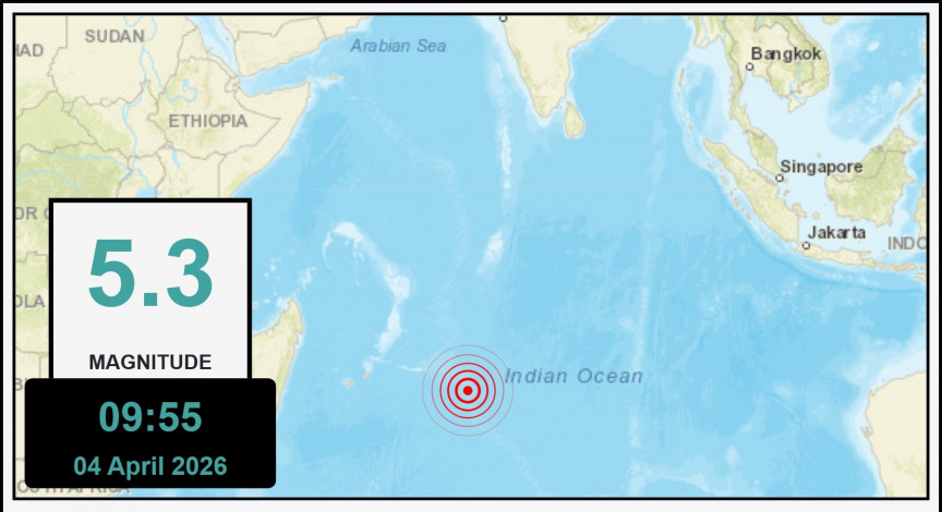 A 5.3 magnitude earthquake has struck 2,553 kilometers off Addu City, according to the Maldives Meteorological Service.