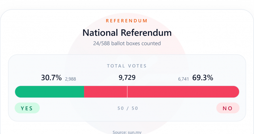The votes counted so far in the referendum held on Saturday on whether to ratify the government-backed amendment to the constitution to merge the two main elections in the Maldives show that the majority voted against the change.