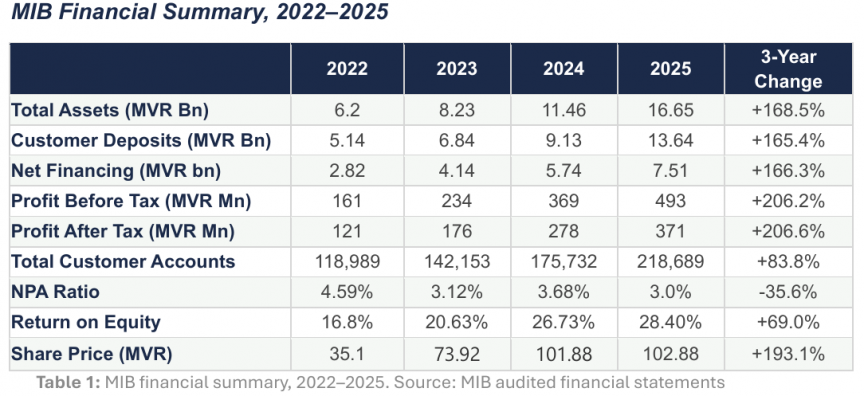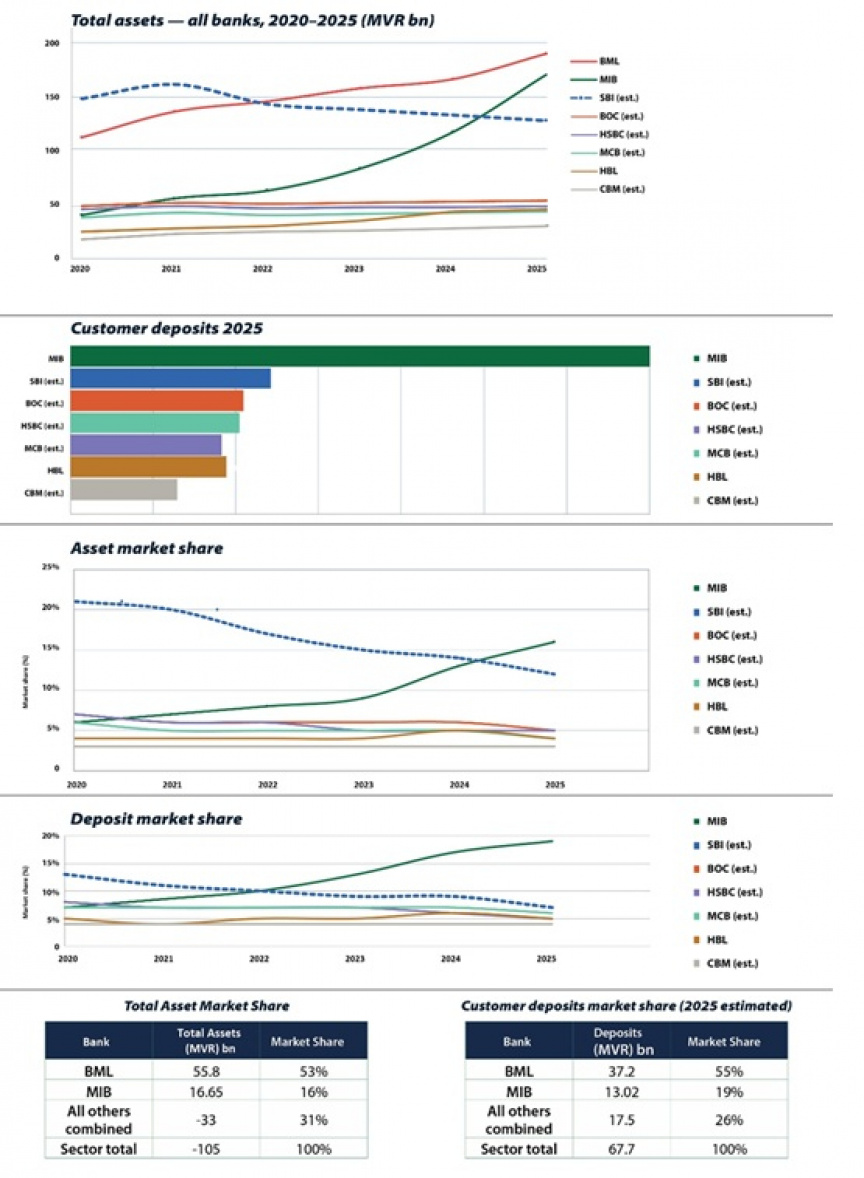 MIB’s estimated share of total banking system assets has grown from approximately 7% to 16%, while its share of customer deposits has nearly tripled from roughly 7% to 19%. No other bank outside BML recorded meaningful growth over the same period — the foreign branches and smaller institutions have remained essentially flat.