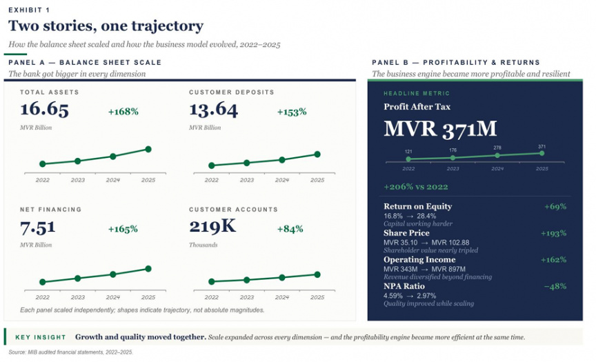 The standout is not any single metric. It is that profitability tripled while assets nearly tripled, deposits more than doubled, and the ratio of troubled financing halved. Banks that grow this fast typically sacrifice quality somewhere. MIB did not.