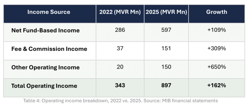 Profits did not triple simply because the bank got bigger. They tripled because MIB found new ways to earn. Total operating income grew from MVR 343 million to MVR 897 million, but the composition of that income shifted materially.
