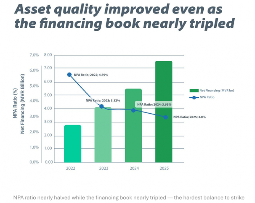 The non-performing advances ratio fell from 4.59% in 2022 to 2.97% in 2025, a 35.3% decline, even as the financing book nearly tripled. In practical terms, for every MVR 100 that MIB has financed, less than MVR 3 is in difficulty today, compared to nearly MVR 6 three years ago.