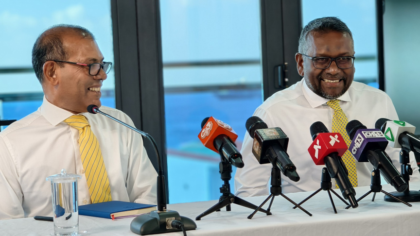 Mohamed Nasheed (L) and Fayyaz Ismail (R) attend a press briefing on April 19, 2026. (Sun Photo)