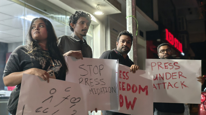 The Maldives Journalists Association (MJA) has expressed concern over the police search of the newsroom. Some journalists also staged a protest outside the office.