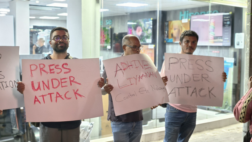 Journalists protest in front of Adhadhu news office after Police enter the premises with a search warrant, April 27, 2026. (Sun Photo/Ahmed Iyaadh)