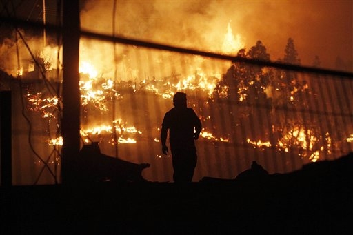 VALPARAISO, Chile (AP) — Helicopters and airplanes dumped water on wildfires and the smoldering wreckage of hilltop neighborhoods around Valparaiso for a third straight day Monday as sailors in riot gear stood ready to evacuate 700 more families whose homes could be lost if the winds shifted.