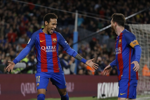 BARCELONA, Spain (AP) — Lionel Messi and Neymar scored three spectacular goals to keep Barcelona atop the Spanish league after routing Celta Vigo 5-0 on Saturday.