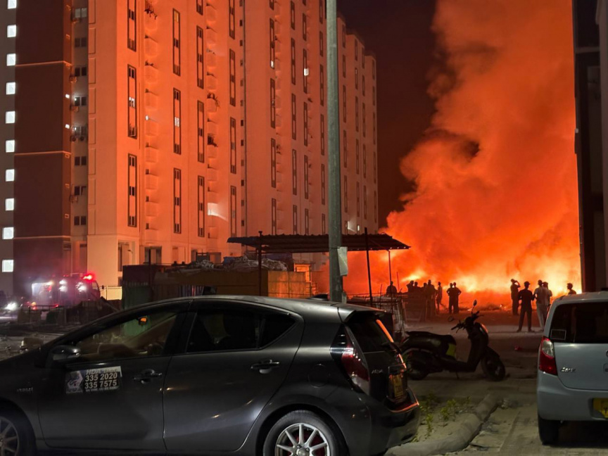 Firefighters responded to a blaze near the ‘Gedhoruveriya’ flats in Hulhumale’ Phase II on early Saturday, after a large pile of waste near the towers caught on fire. The fire, which originated from a pile of waste near the Dhoadhi 11 tower, was reported to the Maldives National Defense Force (MNDF) at around 02:21 am. The MNDF said that firefighters from the